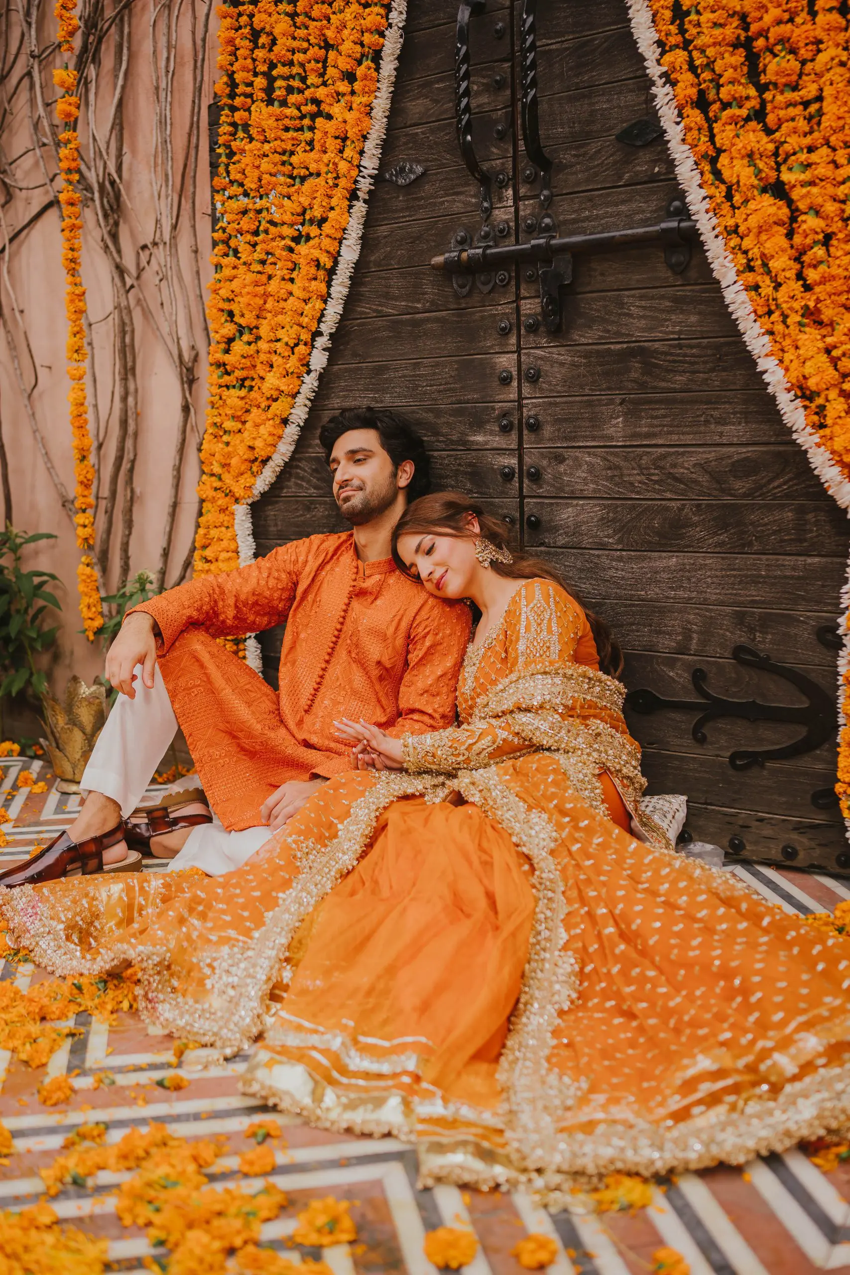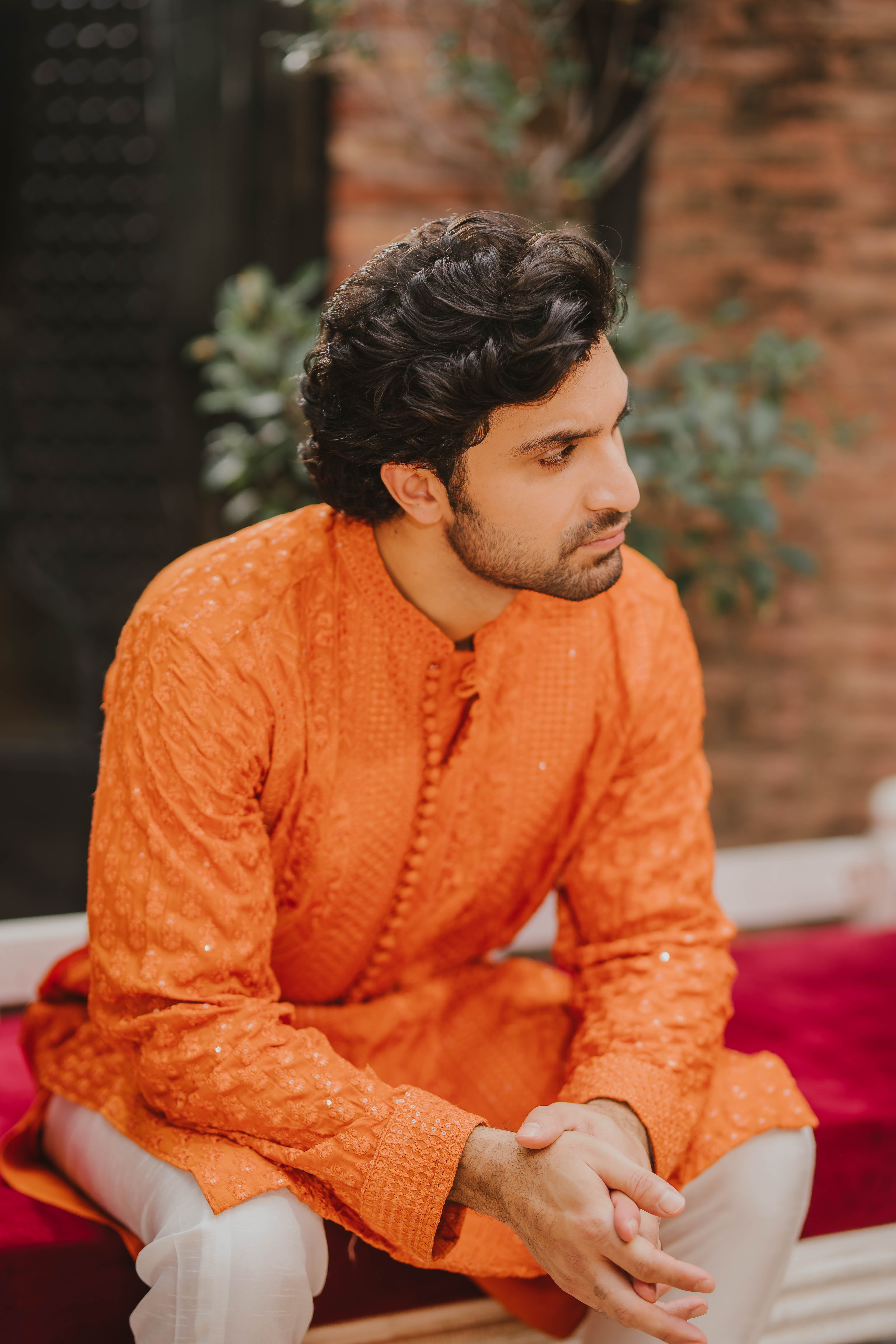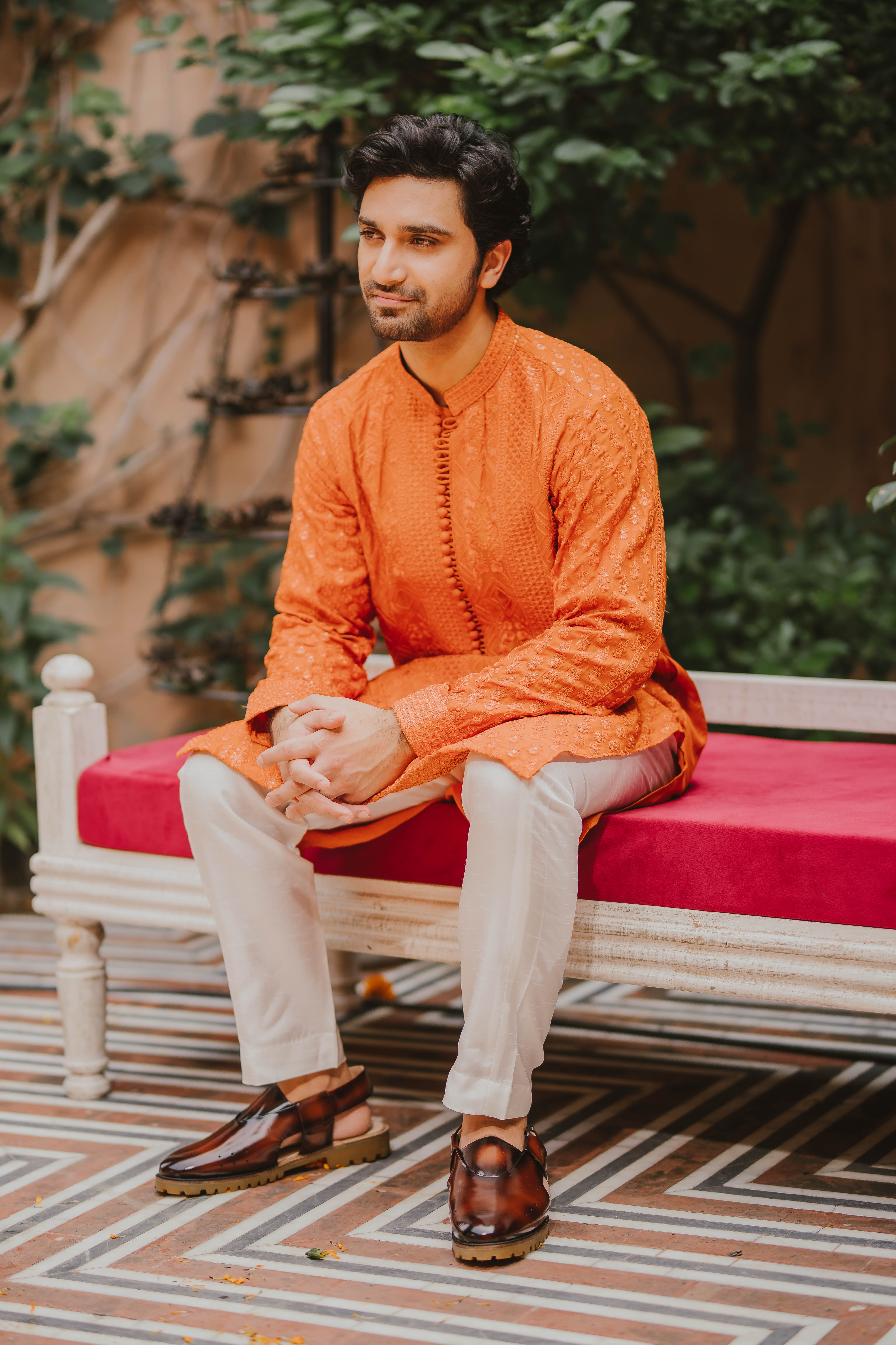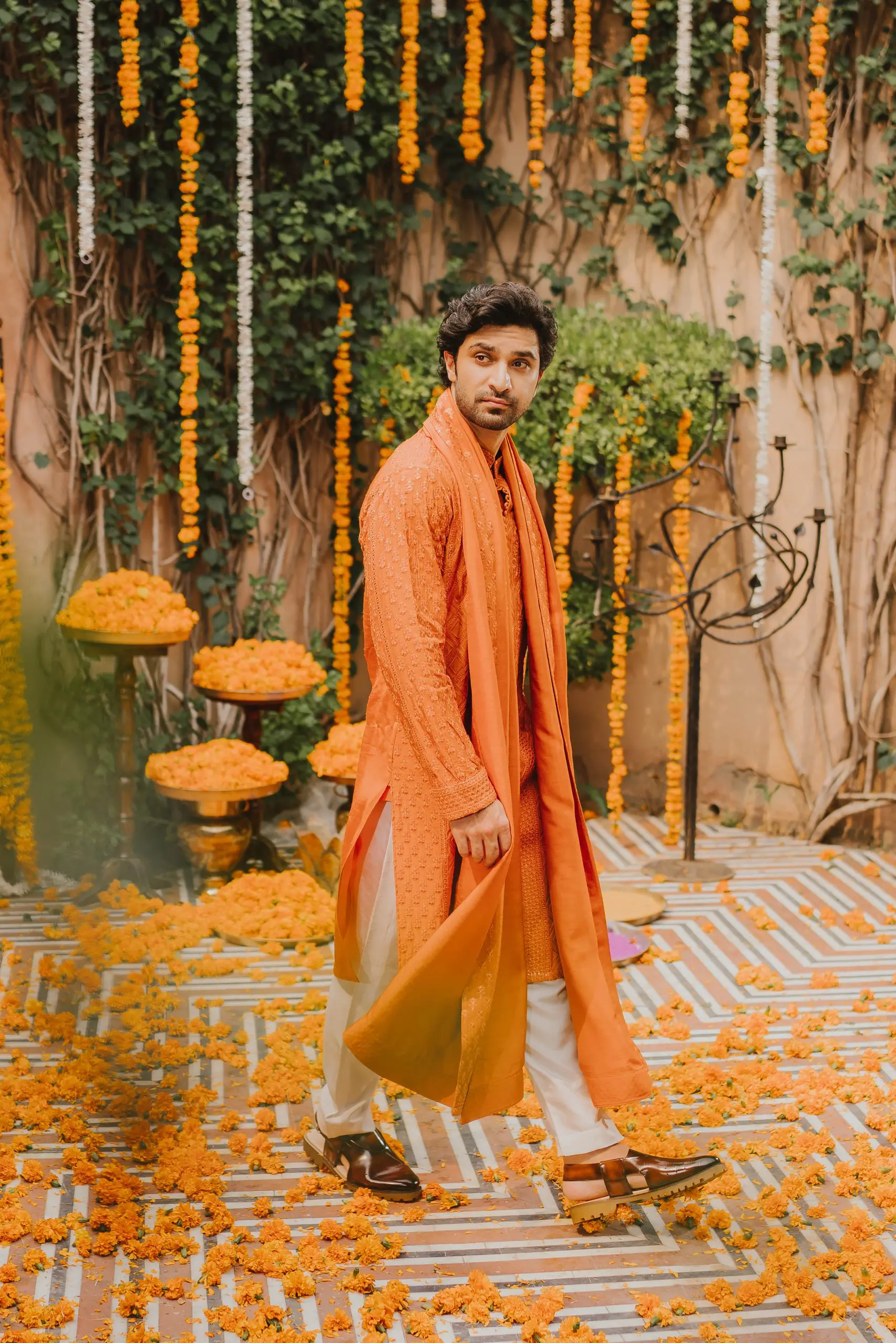 Raw Silk Orange Kurta with Embroidery and Hook Buttons with a matching Embroidered Shawl