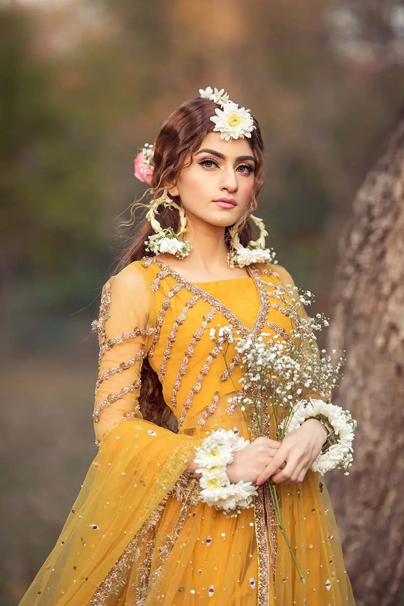 This timeless yet beautiful article based on net front open Peswash and dupatta elegantly ornamented with Tilla, Beads, Resham and Zari paired with a simple raw silk lehenga can be a perfect pick for your Mehndi or Mayon event.