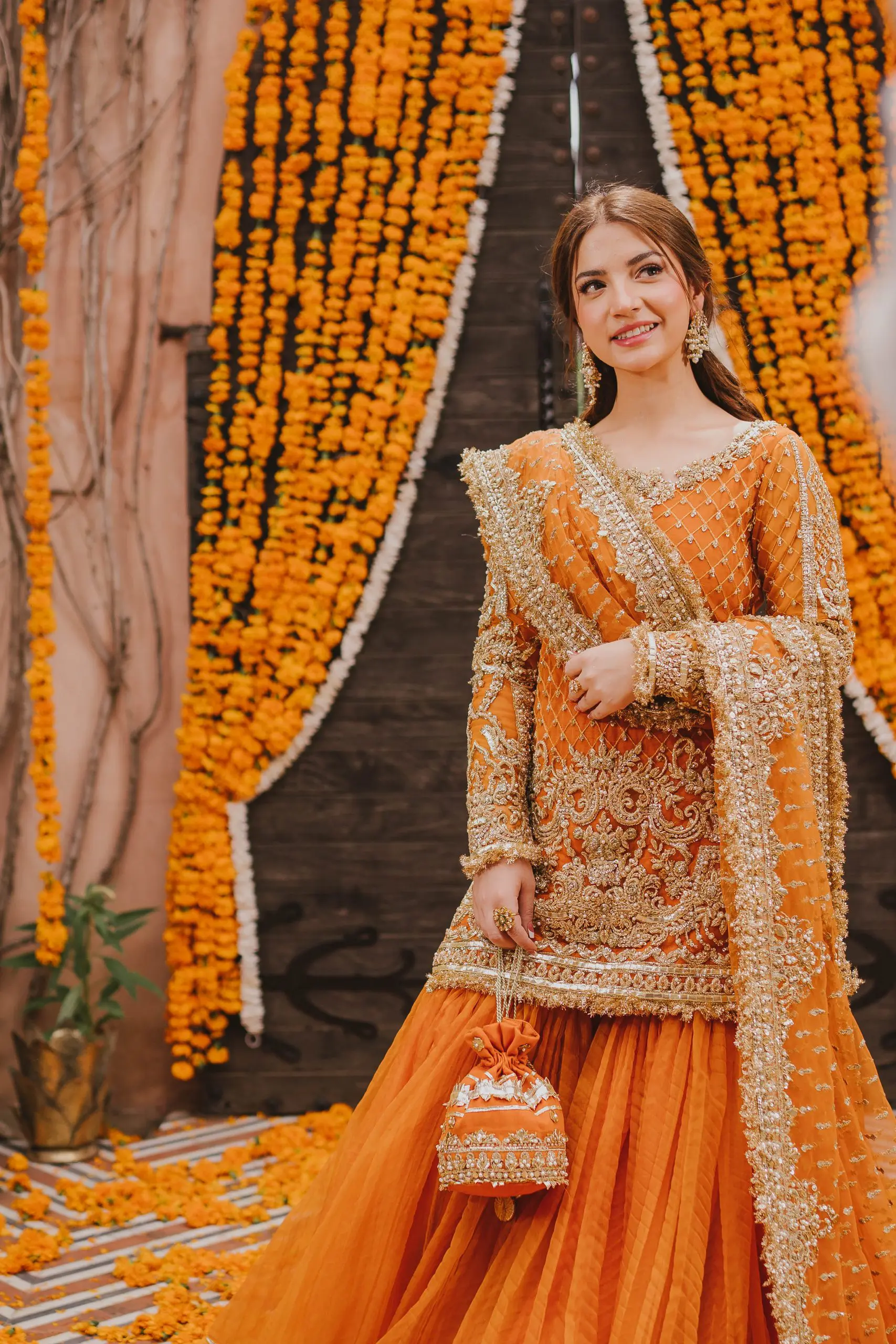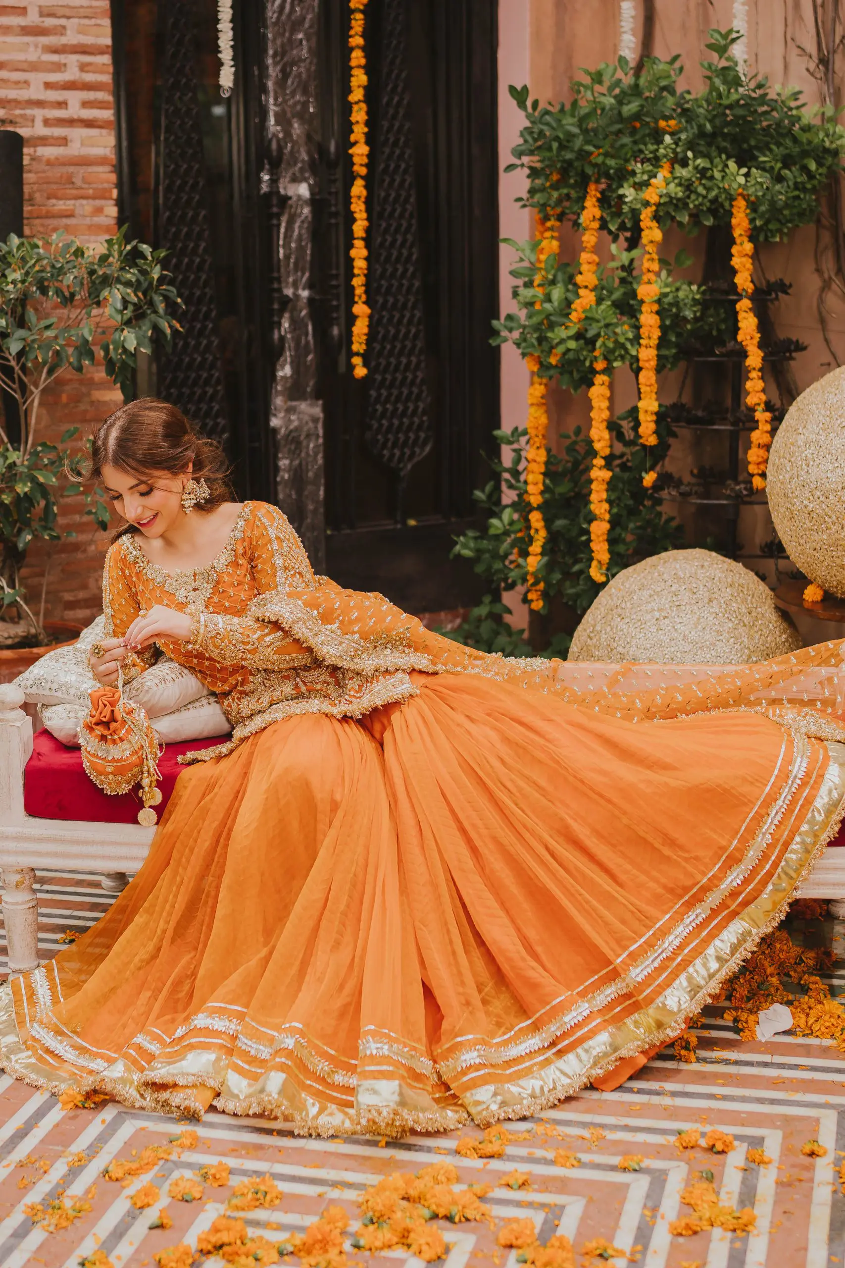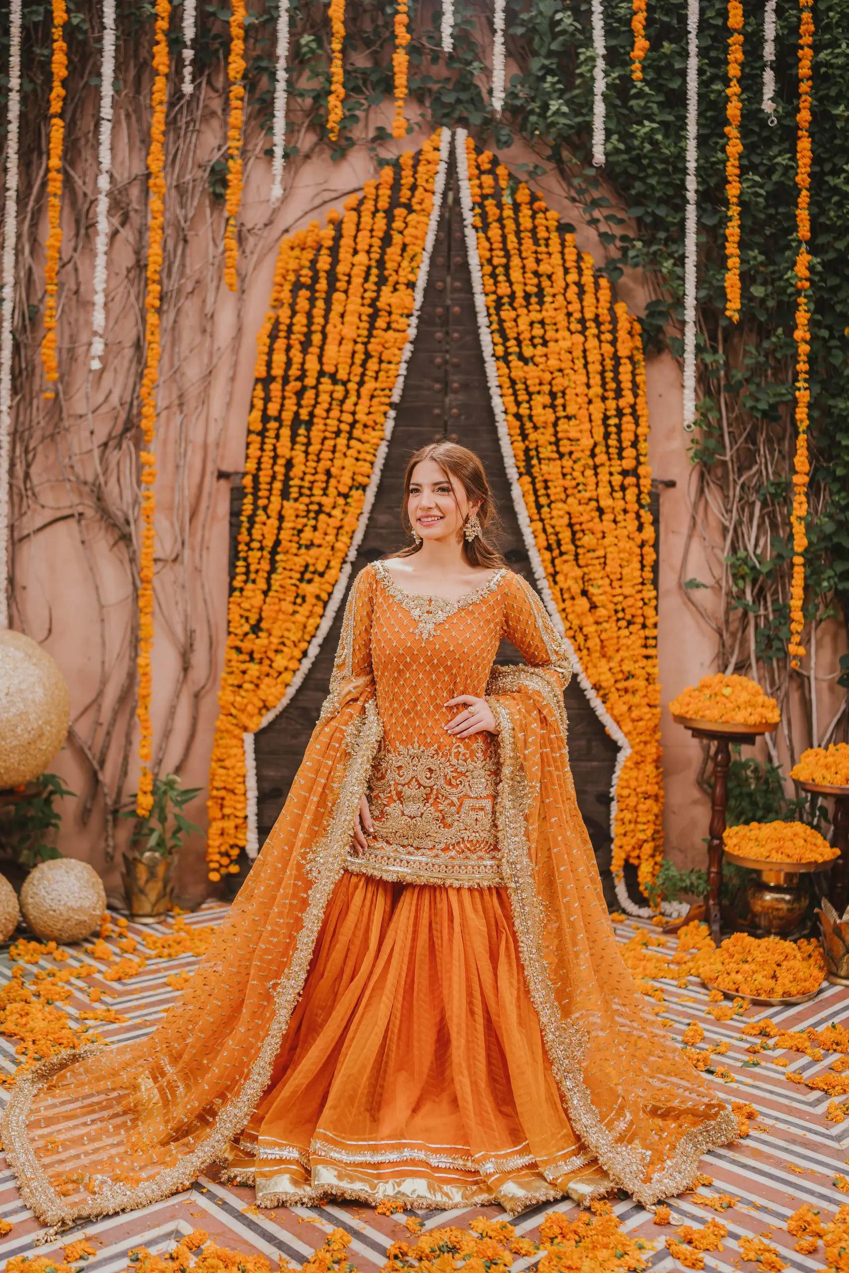 An Exquisite Orange shirt which is heavily Gold Embellished with Gotta work, Kora, Dabka and Pearls.